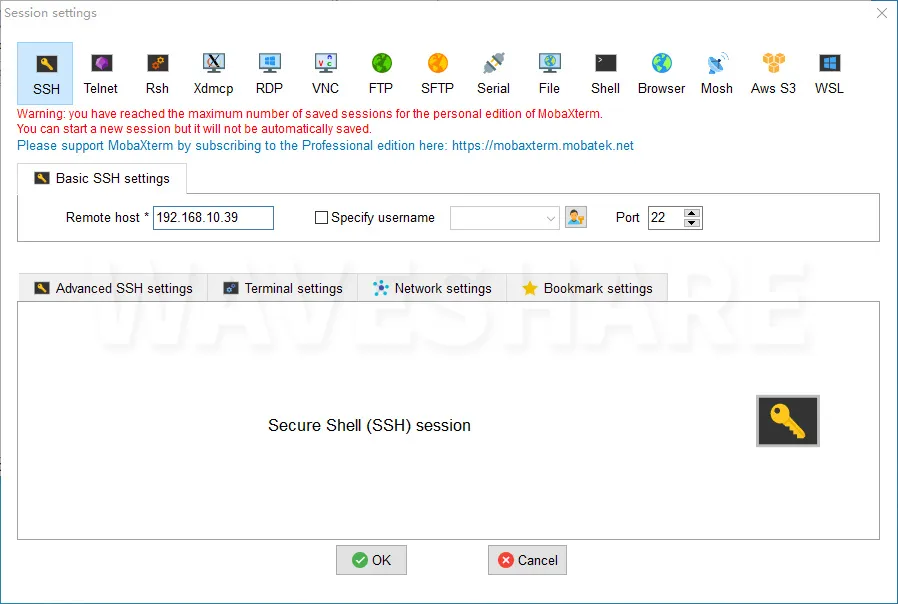 点击session,点击ssh,在Remote host输入树莓派的IP地址: